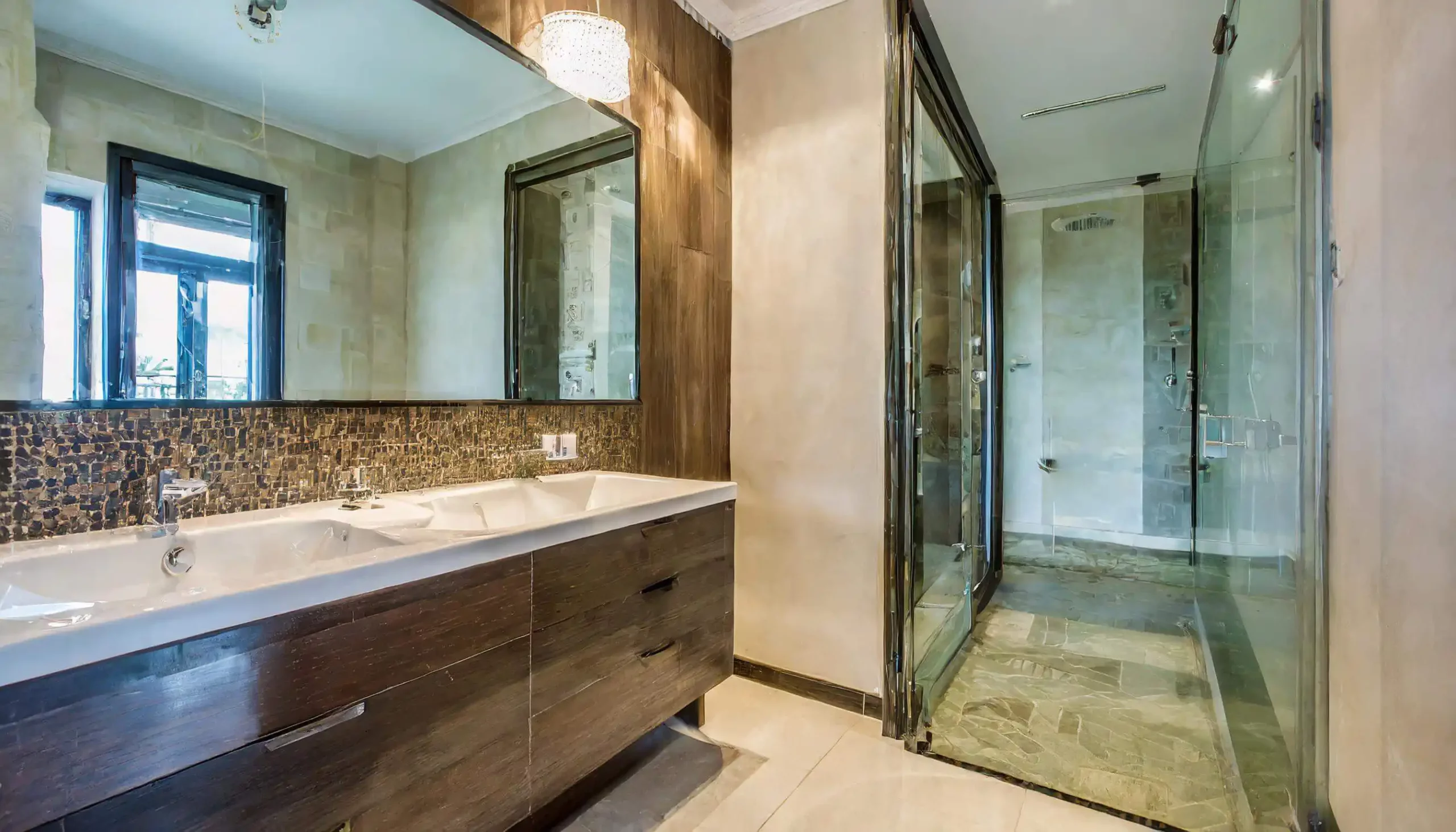 Un dressing et une salle de bain avec vasque, toilettes et douche à l’italienne sont également inclus dans la chambre attenante.